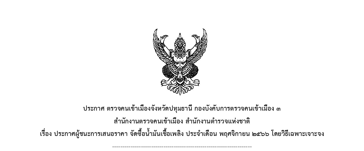ประกาศผู้ชนะการเสนอราคา จัดซื้อน ามันเชื้อเพลิง ประจำเดือน พฤศจิกายน ๒๕๖๖ โดยวิธีเฉพาะเจาะจง