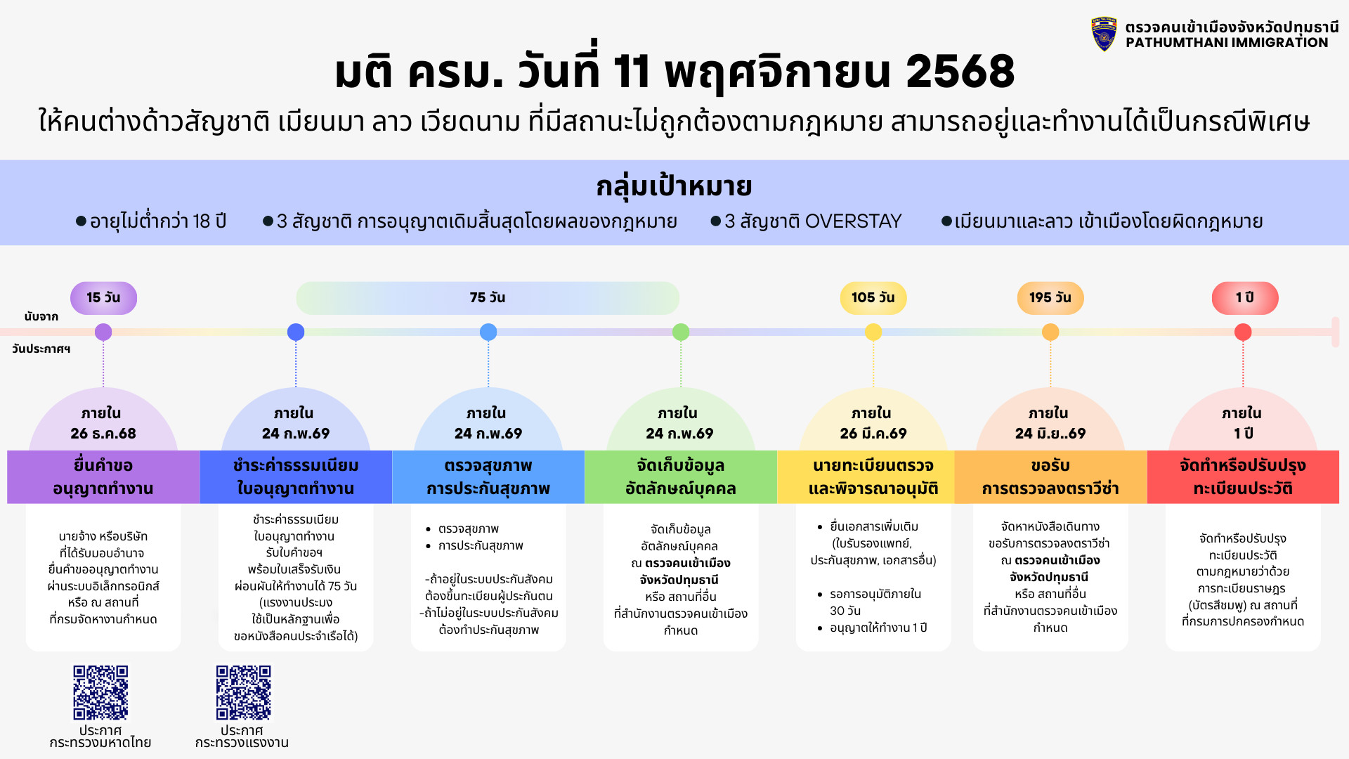 ประชาสัมพันธ์ มติ ครม. วันที่ 11 พ.ย.68 ให้คนต่างด้าวสัญชาติ 01/01/202615/02/2026 admin ประชาสัมพันธ์ ประชาสัมพันธ์ มติ ครม. วันที่ 11 พ.ย.68 ให้คนต่างด้าวสัญชาติ เมียนมา ลาว เวียดนาม ที่มีสถานะไม่ถูกต้องตามกฎหมาย สามารถอยู่และทำงานได้เป็นกรณีพิเศษ