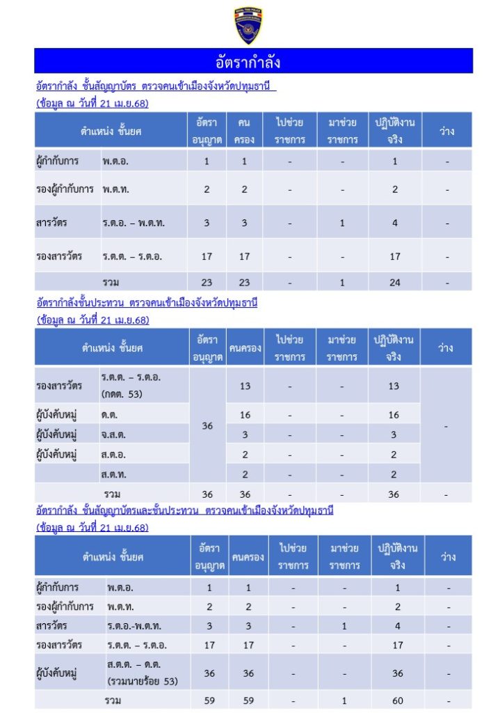 อัตรากำลัง ตรวจคนเข้าเมืองจังหวัดปทุมธานี